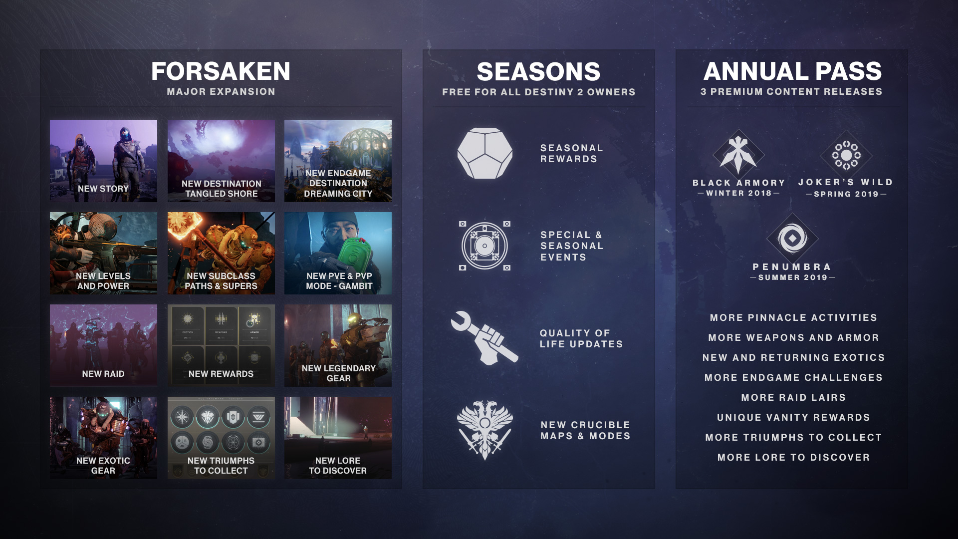 Earlier this week, we published a new Development Roadmap. Previous editions of this forecast were more focused on our plans for the future. With our immediate future looking brighter—even with a darker story to tell—we're using the Roadmap to telegraph the updates you'll need to download before your second year of Destiny 2 can begin.
