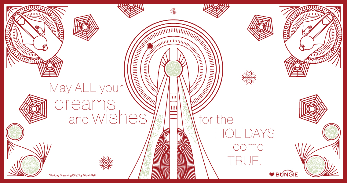 In preparation for the holidays, several TWABs ago we asked the community to use their artistic talents to create a Bungie Holiday card for 2018. We received a lot of incredible entries and it was hard to choose just one. In the end we selected this fine piece created by Micah Bell.