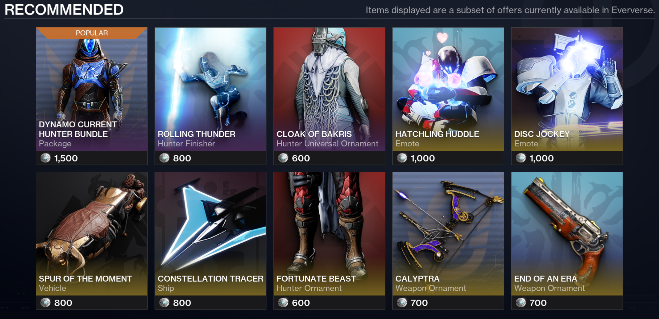 One more thing before we hand it over to Player Support: Eververse is getting an update in Season 21that showcases items recommended just for you. In addition to continuing to highlight specific items and bundles, the Eververse Featured page will also have a shortcut to view certain recommended items that you don't own and might find are a great fit for your character. Not only that, but there will also be a tab where you can view your top-ten recommended items in one place, making it easier to find all of your recommendations at any given time.