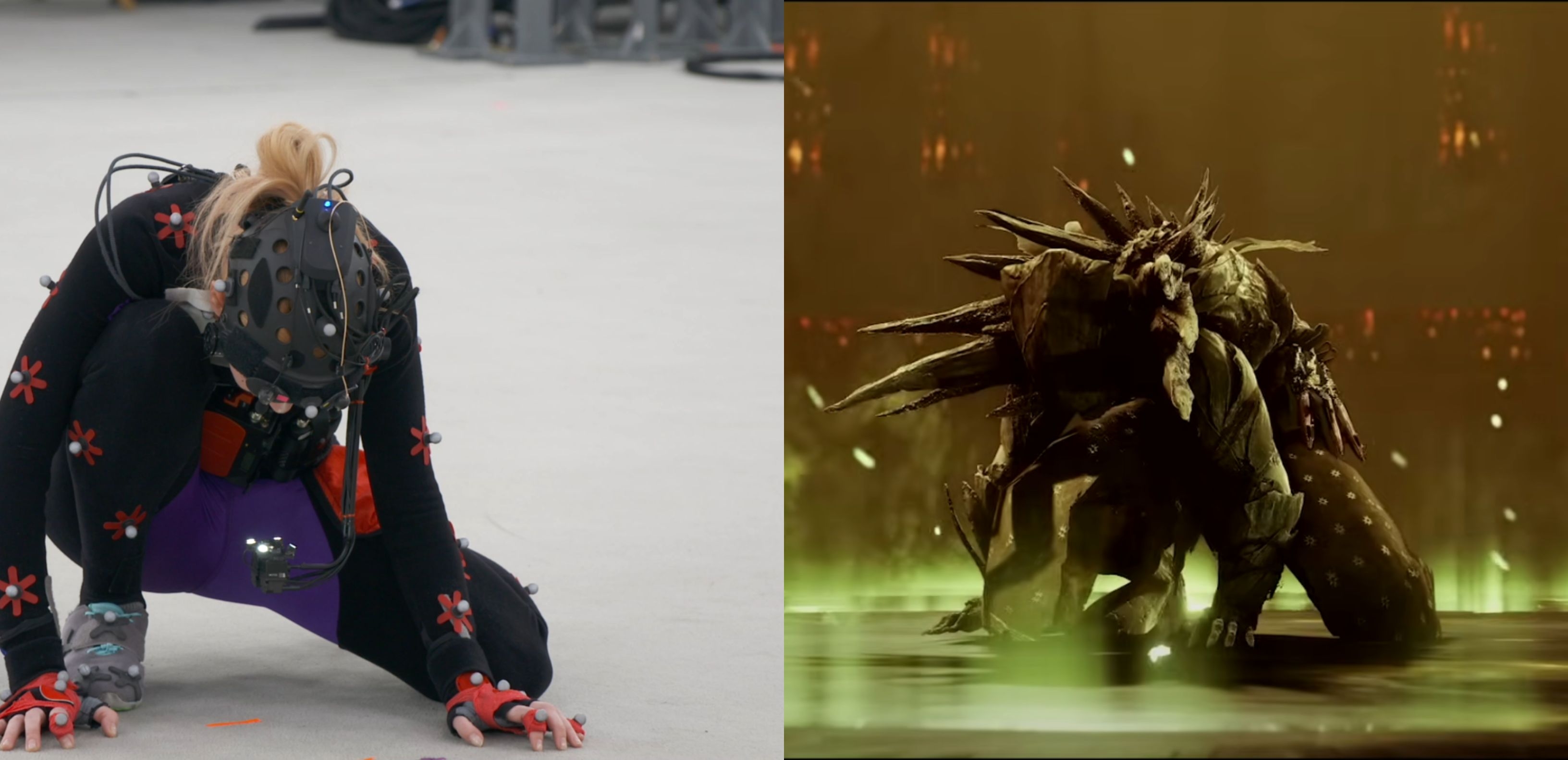 In the end, they actually split up the meshes, stacked them, used part swapping on the visible pieces that would change using blendshapes in Maya, and then matched vertex animation in engine. Jane Kim shot the cameras, Keith Reicher handled the edit, and our whole Cinematics Animation team came together to add to and accentuate what we got from our on-stage talent. Extra shout-outs to Melissa Chan and Andrea Ratsos for all the animation work they did on the transformation itself, Jacob Saunderson for all those swirling green VFX, and Mike Poe for the lighting and grade!