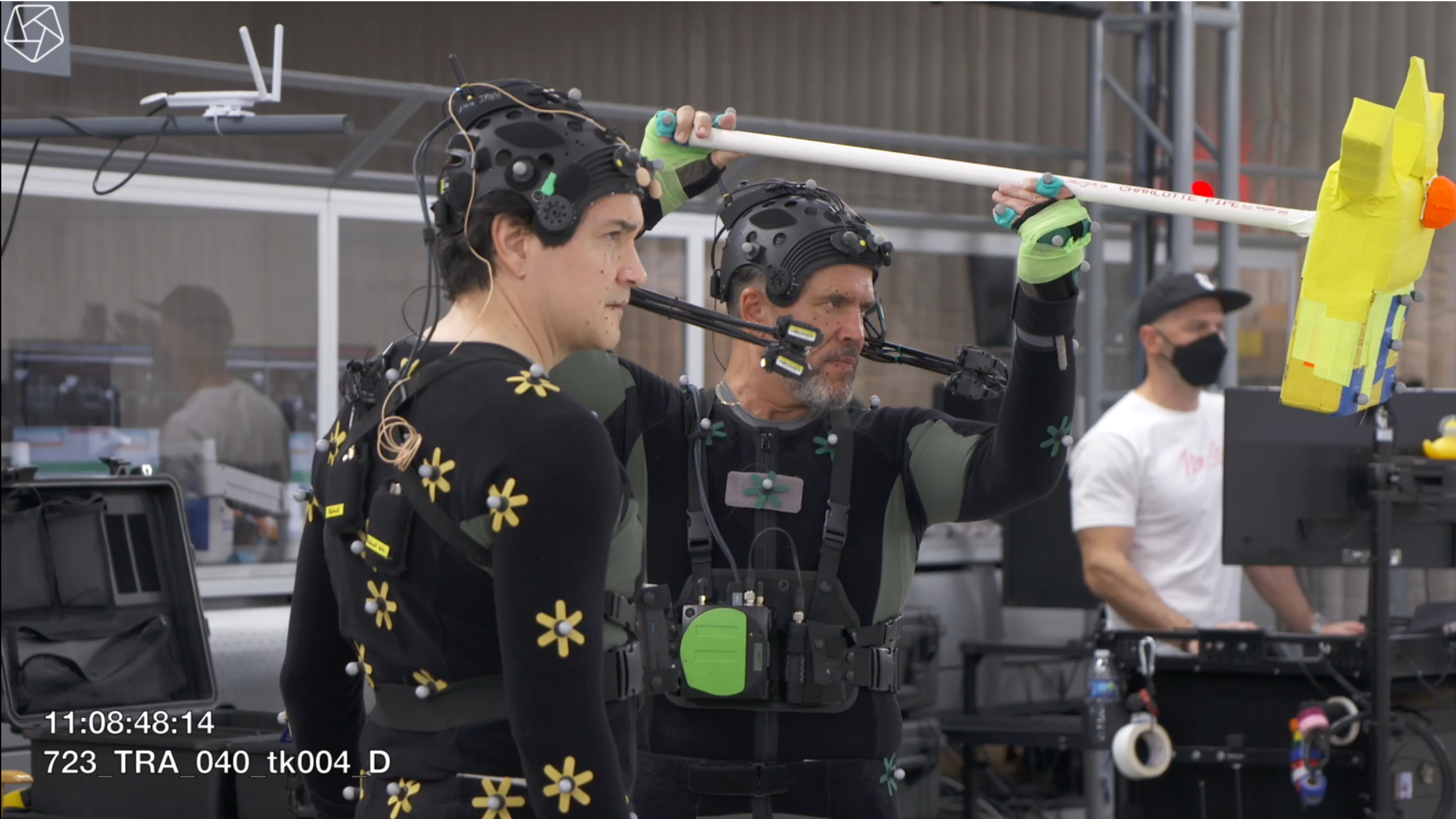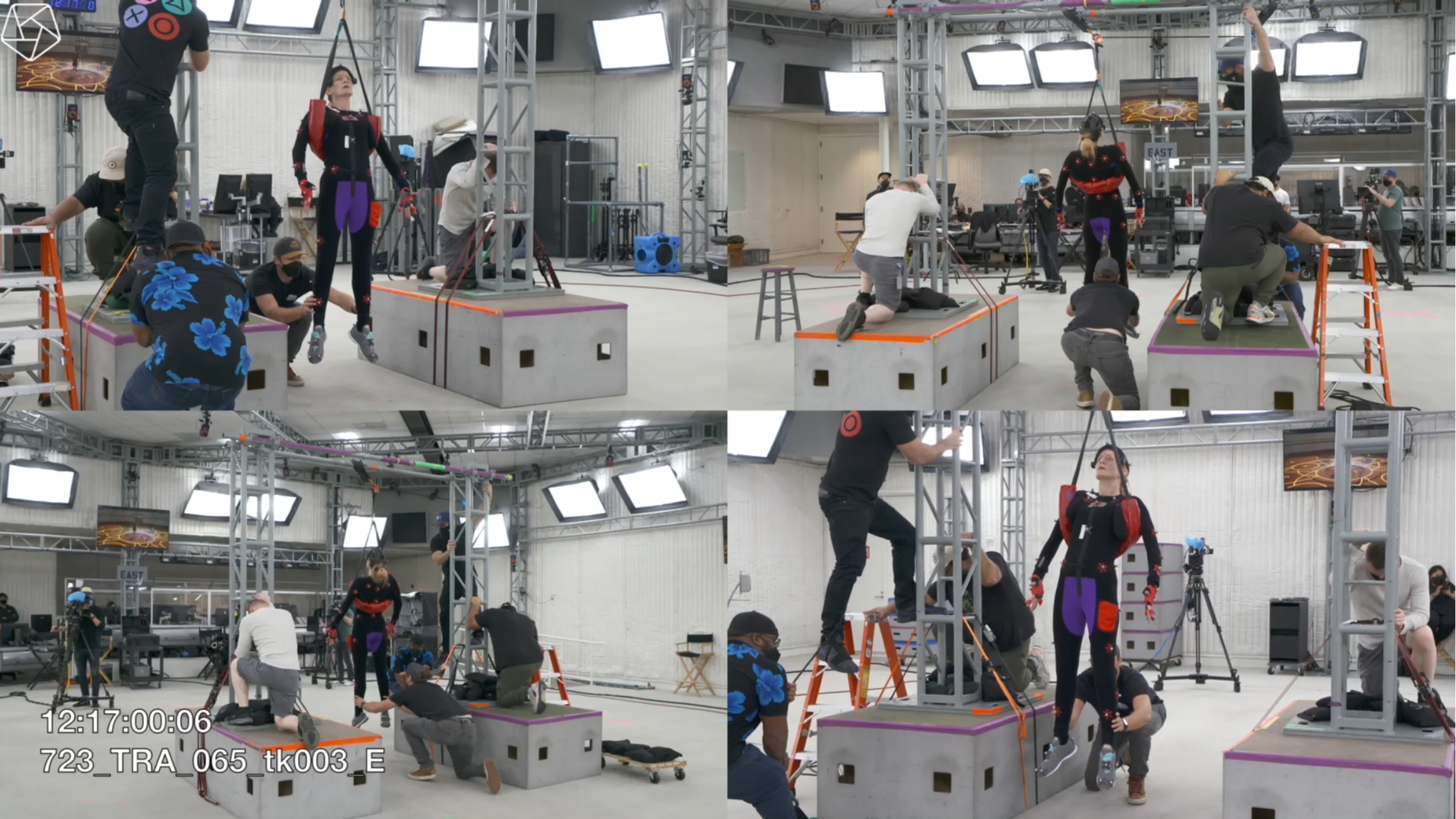 For the shoot, we are lucky to work with awesome talent who have embodied these characters for a decade. Morla Gorrondona played Eris, Alysson Kulavis played Ikora's body (with facial capture from Mara Junot, Ikora's voice actress, combined), Richard Sloniker played our hearty Guardian, and Brandon O'Neill, who you may also know as Crow, played Immaru. Having all of them on stage, building on each other's performances was a fantastic experience, and I count myself lucky to work with such talent so regularly. The crew at Sony's mocap stage built an adorable Immaru-on-a-stick that we used for eyelines and a starting place for animators. (Shout out to Xavier James in animation for getting "the grab" to feel so satisfying, along with David Shaughnessy's excellent voice work.) They also taped down proxies for the Hive runes that Eris would be tracing on the floor. Charles Searight and Rachel Swavely in our mocap team did a bang-up job prepping all of these assets before the shoot!