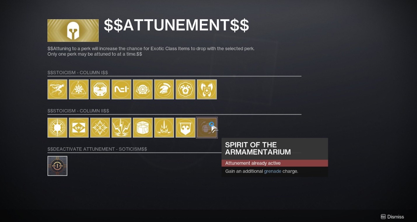 Over the last few weeks, we've been talking to you all about some plans to address feedback surrounding Exotic Class Items. At this time, players can earn them first by completing Dual Destiny, then by completing subsequent Dual Destiny activities or through Overthrow Chests in the Pale Heart. While we're still noodling on additional sources, we're also working on attunement options to help slim down how many Exotic perks are competing for placement on your drops. We'll have more information in the coming weeks, but here's a sneak preview that we shared on Monday through our D2Teams accounts: