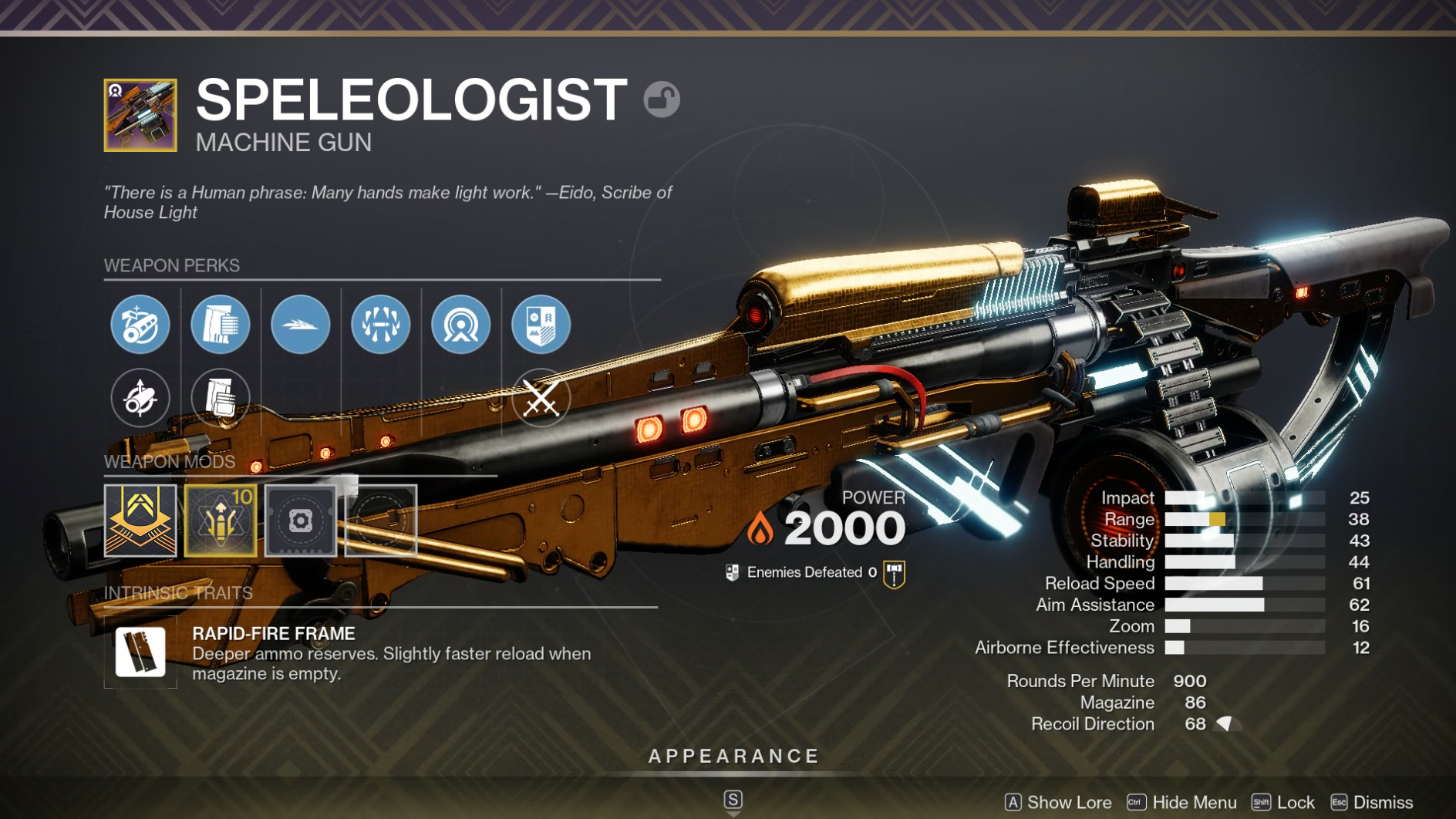We don't have many Solar Machine Guns, and this one's an add-clear monster, using the deep magazine and reserves of Rapid-Fire Machine Guns to fuel combos like Stats for All + Incandescent, or Deconstruct + Killing Tally.
