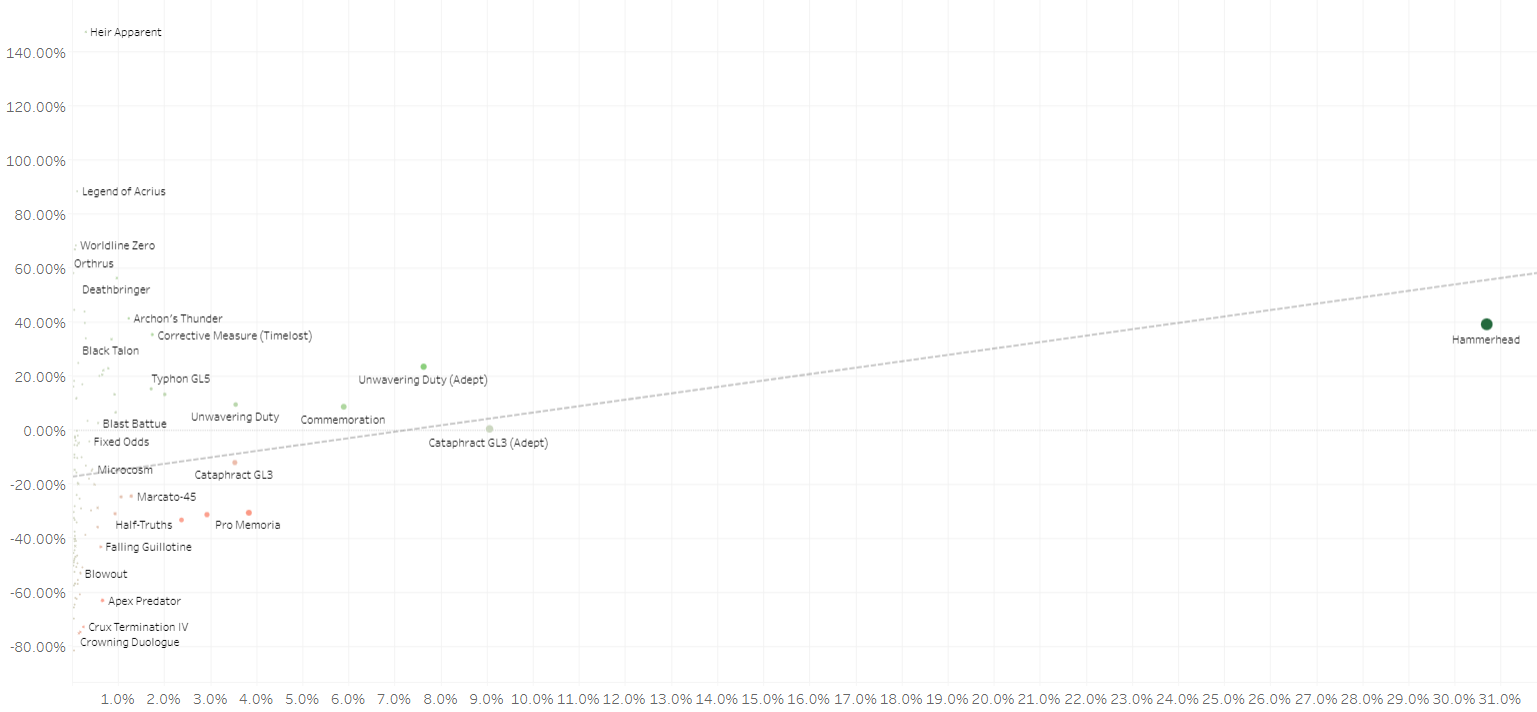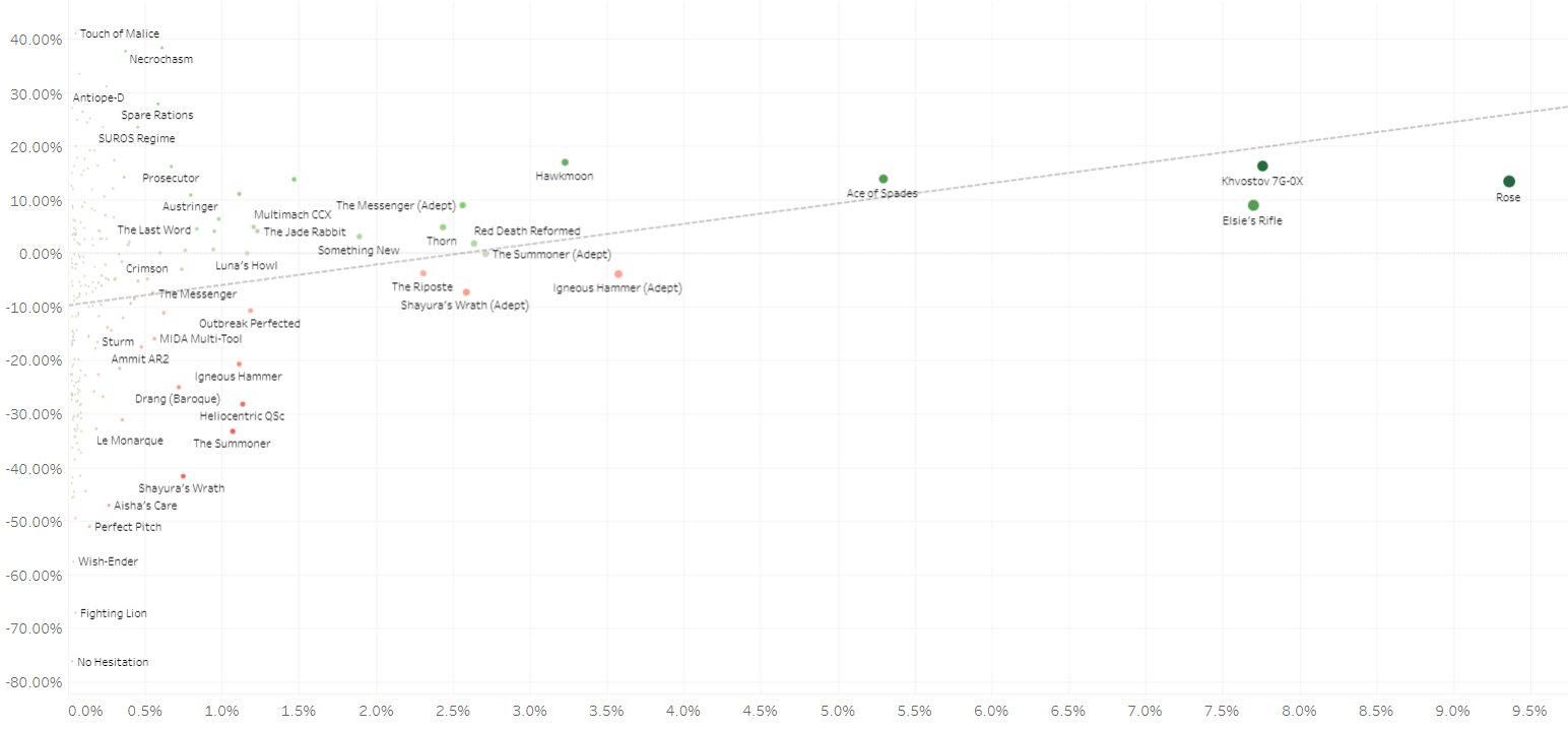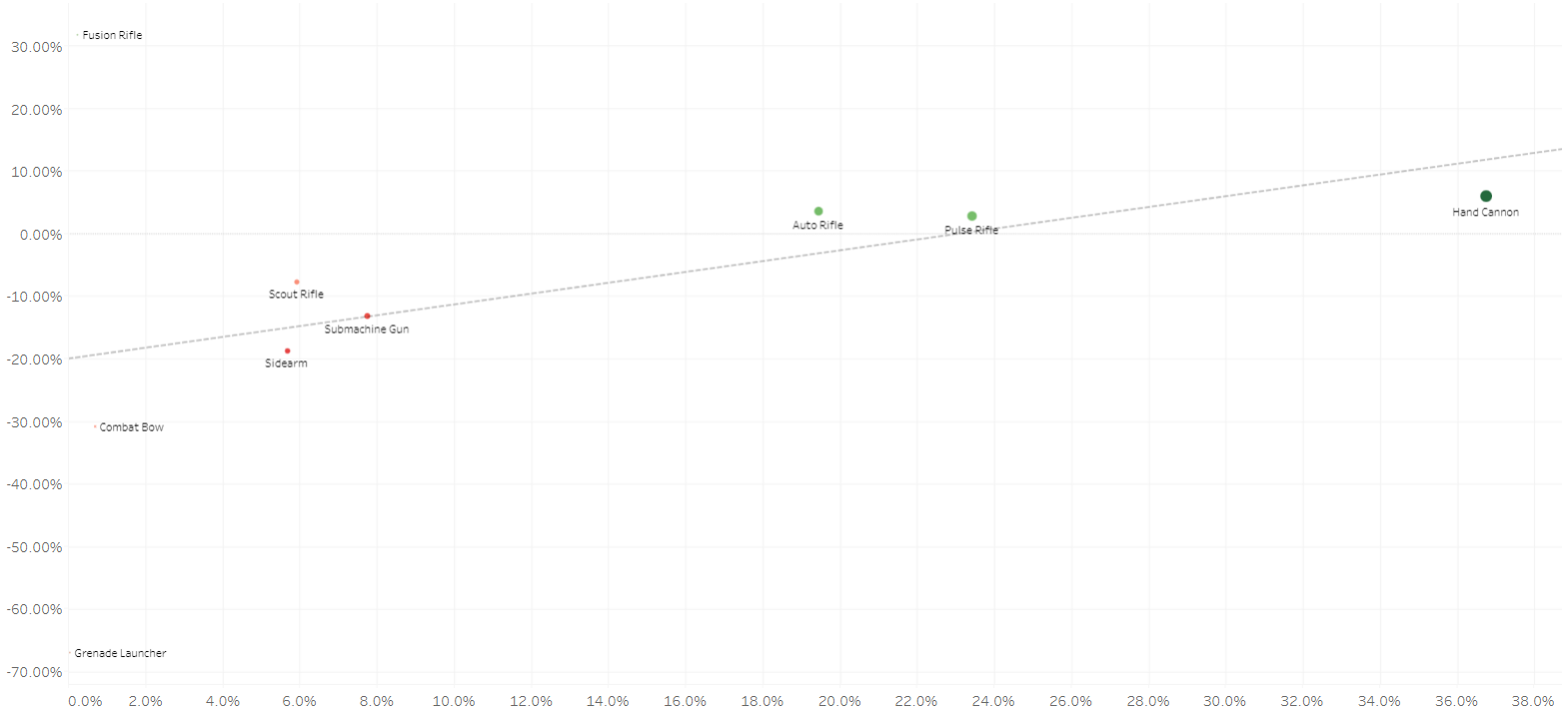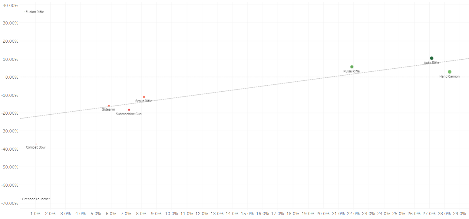 As you can see from the charts below (Kills Over Expected displayed on the Y-axis and Percent of Kills on the X-axis), we don't have a ton of outliers. Hand Cannons are the clear favorite at high skill levels, but Auto Rifles and Pulse Rifles are both making a strong showing, and our more niche Primary weapons (Submachine Guns, Sidearms, and Scout Rifles) are all similarly clustered.