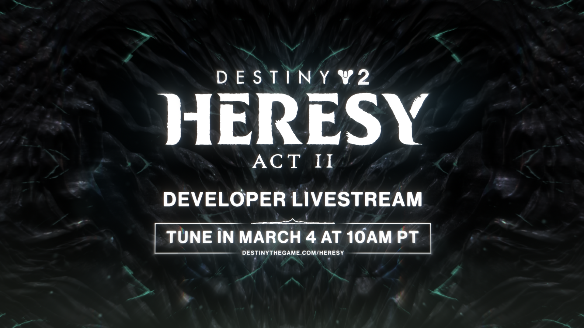 Join us on Tuesday, March 4 at 10 AM PT as we give an in-depth look at Heresy Act II. The dev team will be taking you through the new activity, gear, and rewards you can look forward to when Act II launches on March 11. We'll also look ahead with a small preview of Act III.