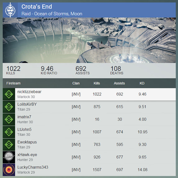 INV: Despite multiple perfect executions, our original strategy for Crota was not doing enough damage to beat the enrage timer. LtJohn5 recommended switching the sword carrier's primary weapon to the Vex Mythoclast, our only Level 32 weapon, to see if it would cause the sword to do extra damage to Crota. This failed miserably, but it did prompt a good idea. Ewok suggested bringing in Matrix, the only Level 31 in our clan, to see if the damage output was higher. Matrix had prepared to level up to 31 by storing Bounties and Marks across his three Hunters. He was also a member of our second team, which was taking a break from the Raid. When he agreed to join our group, we discovered he was hitting the boss 50% harder. Our original sword carrier (Hawk) walked Matrix through our entire strategy to show him exactly what he needed to do. Shortly after, Crota was vanquished.