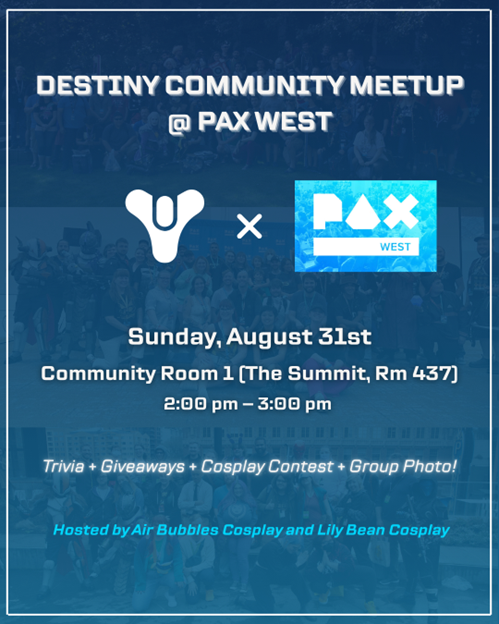 This weekend, PAX West returns to our back yard. For many here, this convention has spawned friendships, careers, and even lifelong partnerships. It's a special place, and we're excited to shine some spotlight on a community-driven Destiny Community Meetup happening on Sunday, August 31 at 2PM PT, hosted by our good friends Air Bubbles and Lily Bean. A few of us will be attending PAX as fans, but don't worry, we're bringing some sweet loot for this meetup, including a handful of The Edge of Fate Collector's Editions , some cooking recipes, and a couple of smaller surprises. Brush up on your lore, adorn your cosplay, and head to Community Room 1 (The Summit, Room 437) at 2PM PT on Sunday.