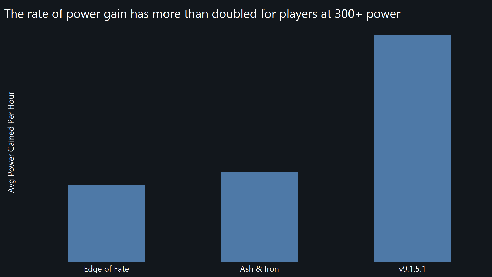 With this in mind, our focus when addressing this feedback in v9.1.5.1 centered around making a much stronger impact on Power progression. In addition to the Techsec Supply Drop chest, which allows players to catch up to 300 power, the rate of Power gained per hour of play has more than doubled for players above 300 Power, as seen in the chart below.