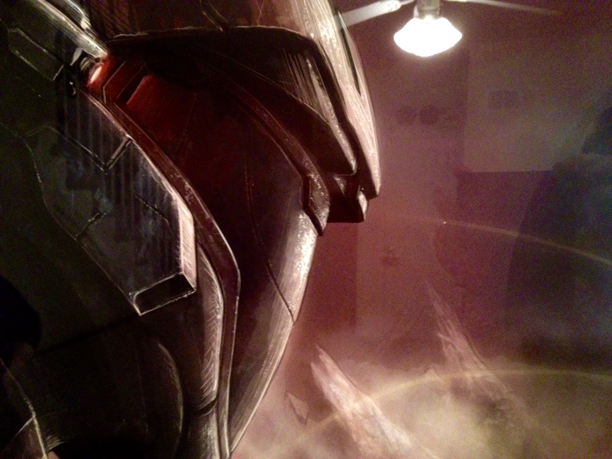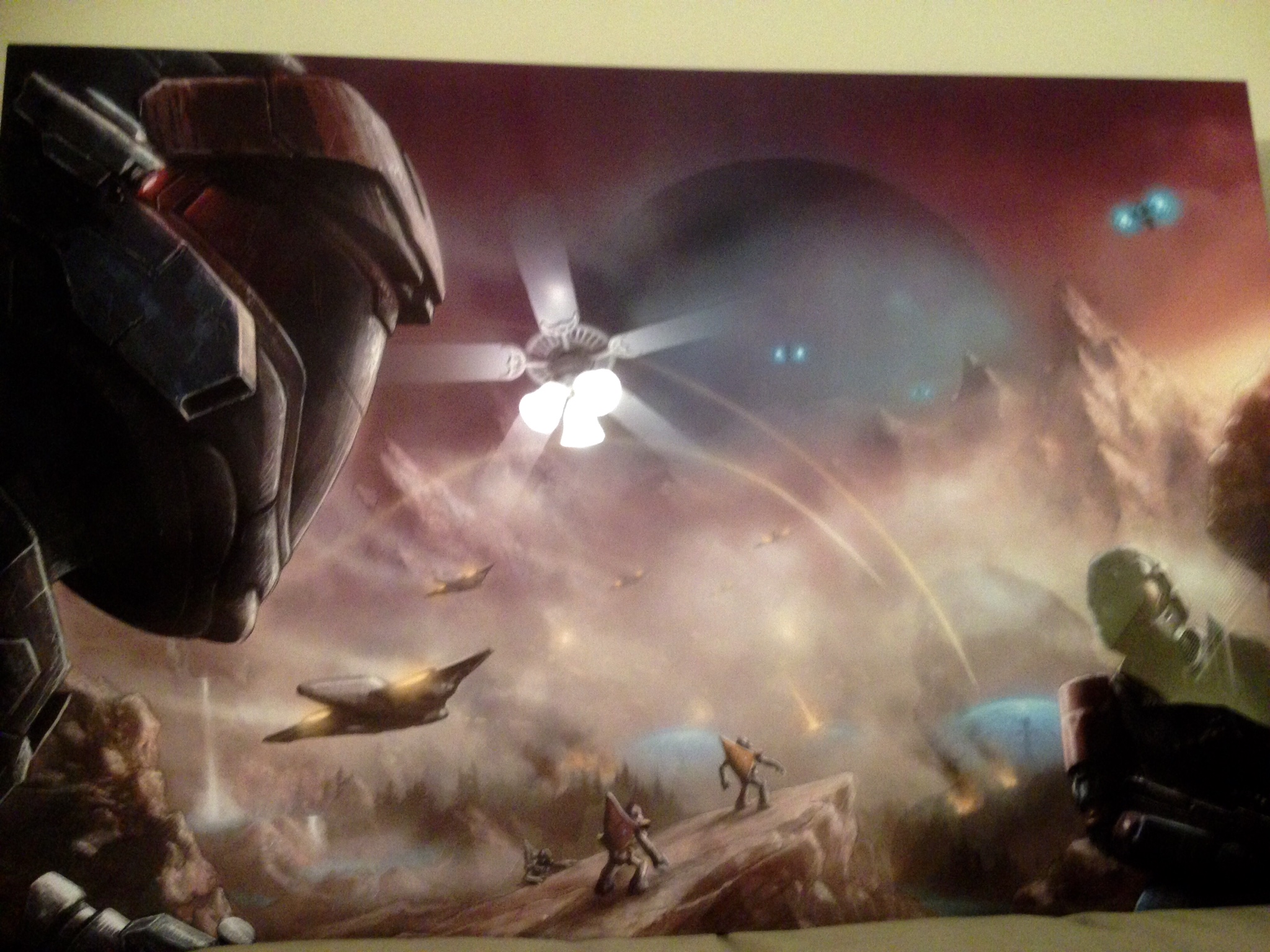 So yesterday we got our artwork from Levi in the mail. I had it metal printed from adoramapix (36"x24") and with a coupon I was able to get it for around $125 + the amount Levi charged us. I tried to take some pictures of it, but it's really hard to photograph. It looks darker in person and because of how glossy it is the artwork looks like it's painted on the back of some really thin glass. The spartans are the Halo:Reach spartans that my wife and I used.
